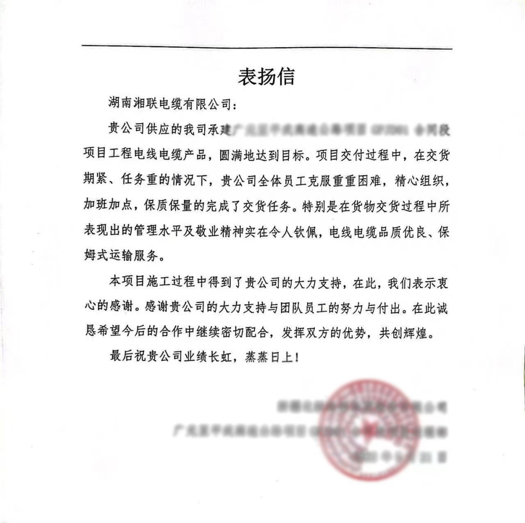 2022年4月18日,湖南省守合同重信用企業(yè)協(xié)會對“2021年度湖南省守合同重信用企業(yè)”進行公示,湘聯(lián)電纜再次上榜。