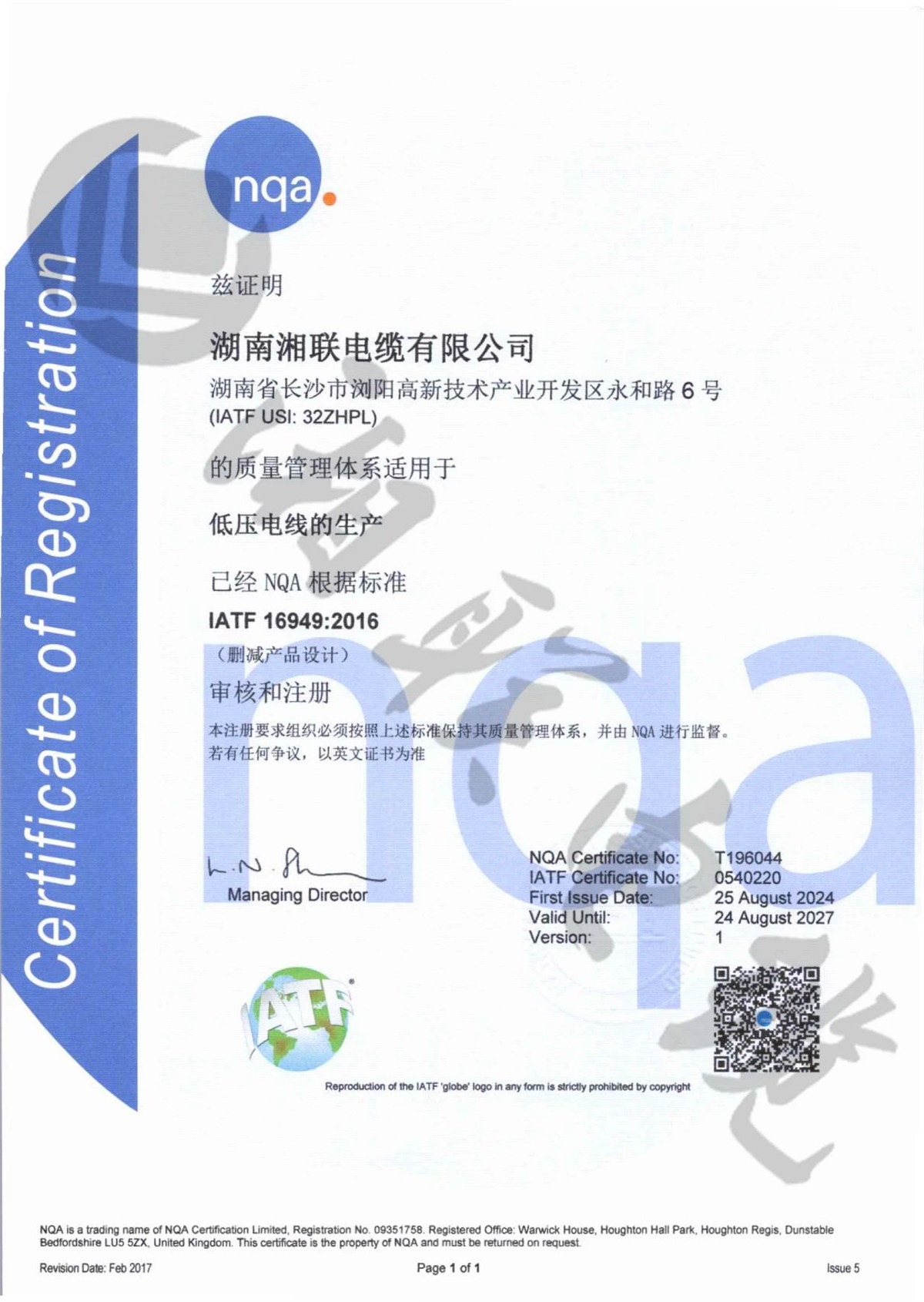 9月,湘聯(lián)電纜成功獲得了IATF16949:2016質(zhì)量管理體系認證。IATF 16949:2016標準是專為汽車行業(yè)設計的質(zhì)量管理體系標準,此項認證標志著湘聯(lián)電纜在質(zhì)量管理體系、產(chǎn)品品質(zhì)等方面均已滿足汽車行業(yè)的高質(zhì)量管理標準。