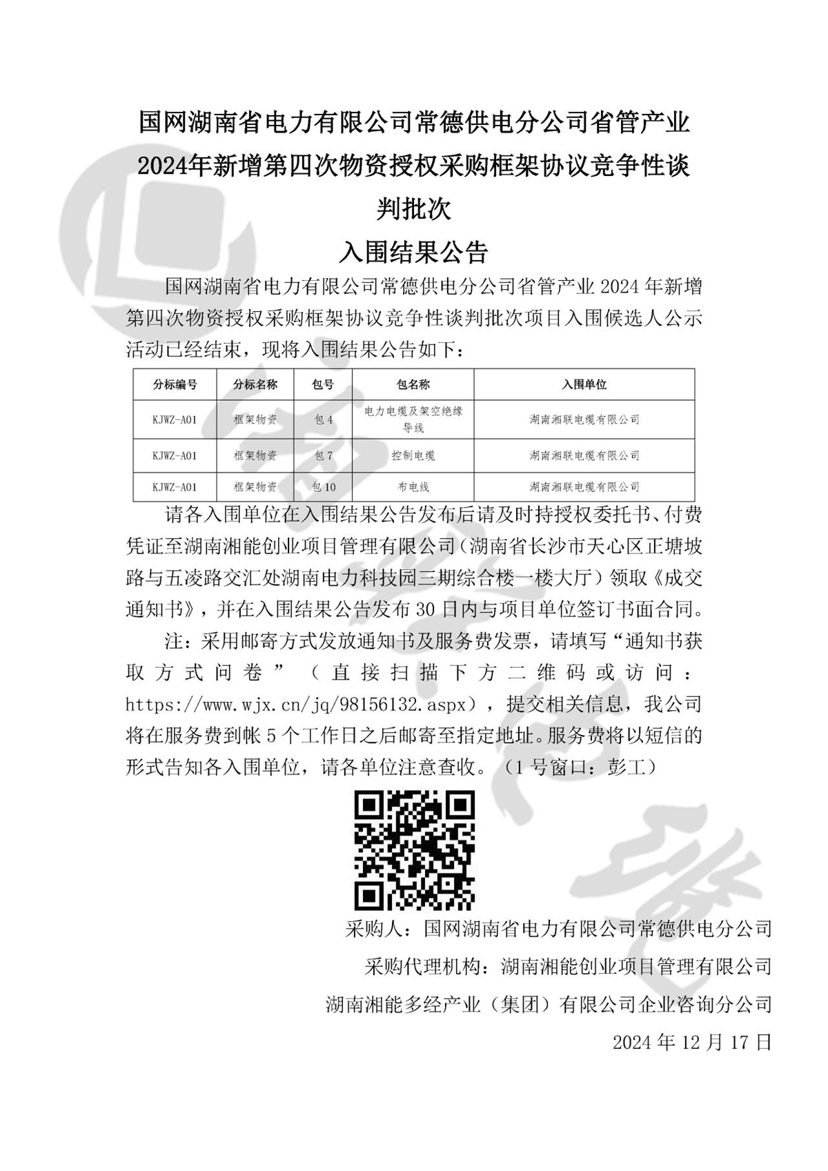 再傳佳訊,湘聯(lián)電纜入圍湖南9家地級(jí)市電力三產(chǎn)公司物資采購(gòu)項(xiàng)目!