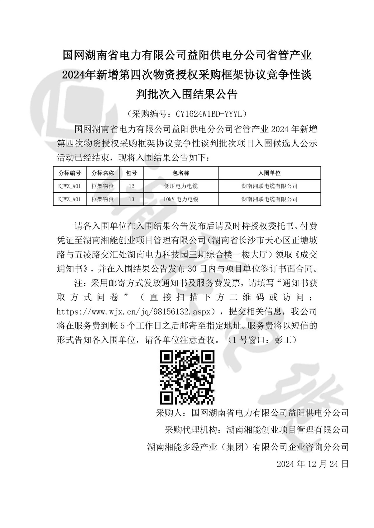 新年伊始,捷報(bào)頻傳,近日,湘聯(lián)電纜陸續(xù)收到9家湖南地級(jí)市電力三產(chǎn)公司2024年新增第四次物資授權(quán)采購(gòu)框架協(xié)議競(jìng)爭(zhēng)性談判批次項(xiàng)目推薦的入圍通知,其中包含長(zhǎng)沙供電分公司、婁底供電分公司、湘潭供電分公司、常德供電分公司、益陽(yáng)供電分公司、岳陽(yáng)供電分公司、張家界供電分公司、衡陽(yáng)雁能供電分公司、長(zhǎng)沙市湘能農(nóng)電服務(wù)有限公司。
