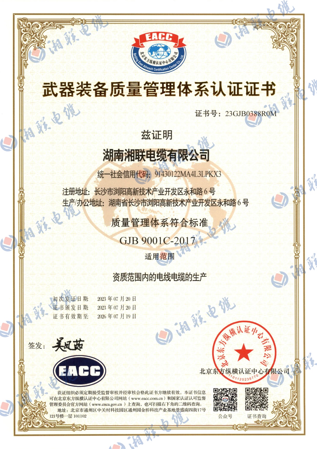 7月,湘聯(lián)電纜順利通過國(guó)軍標(biāo)質(zhì)量管理體系認(rèn)證,獲得《武器裝備質(zhì)量管理體系認(rèn)證證書》。